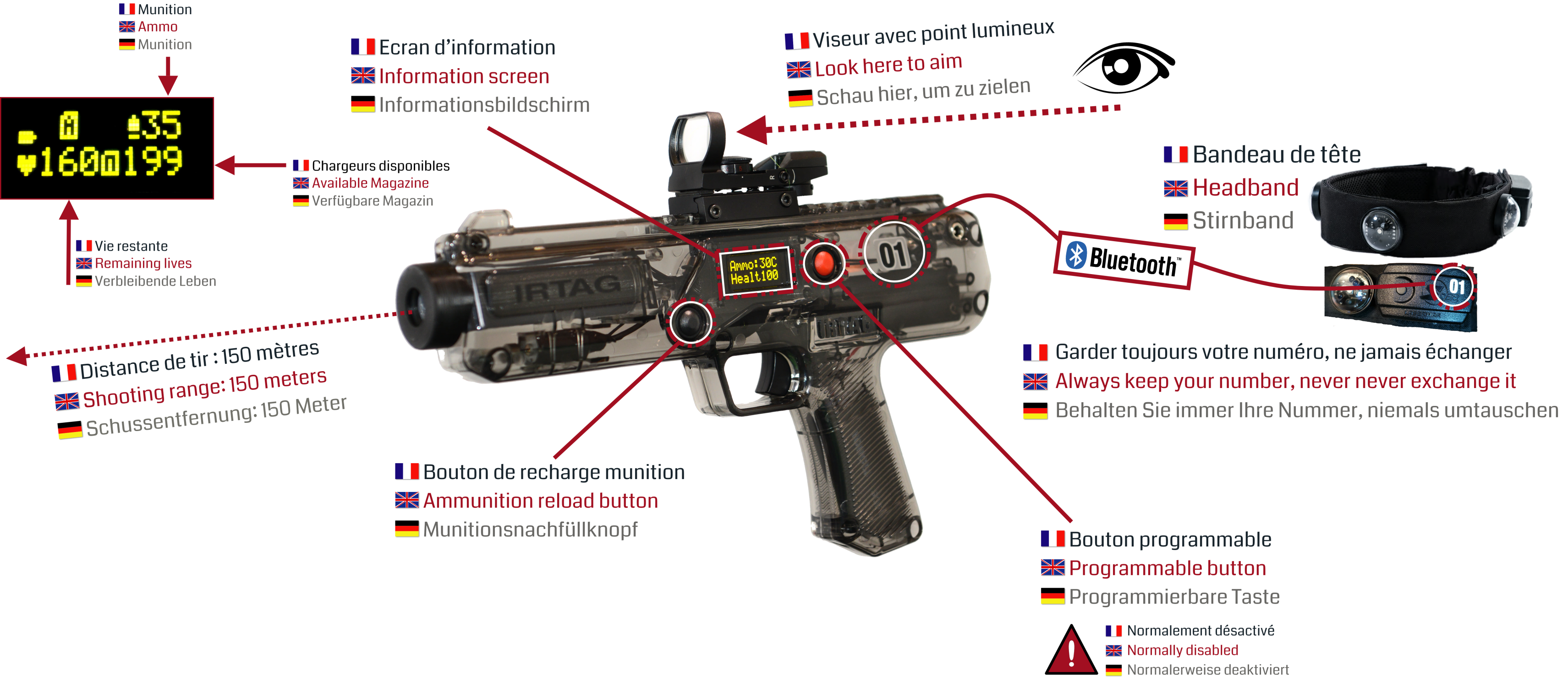 100% risk free because there is no laser, we have developed our own transparent case so that it respects the Swiss legislation and is not considered as a gun or classified as a weapon (this is and remains a Swiss obligation). Don't look for it, you won't find our equipment on amazon or on any other competitor's website and even less on a website that sells weapons. Our equipment is made in Switzerland in the canton of Valais and can boast the SwissMade tag. They are equipped with the best components, namely; vibrations, lcd screen, WIFI, bluetooth, batteries and rechargeable batteries, infrared sensors. These different equipments allow us to propose several game modes with enhanced effects.